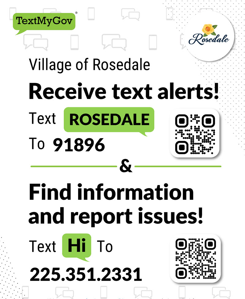 The Village of Rosedale is excited to launch TextMyGov, a new, smart text messaging service! Residents can receive important notifications and text the village to find specific information. For more information about TextMyGov, please visit https://textmygov.com.